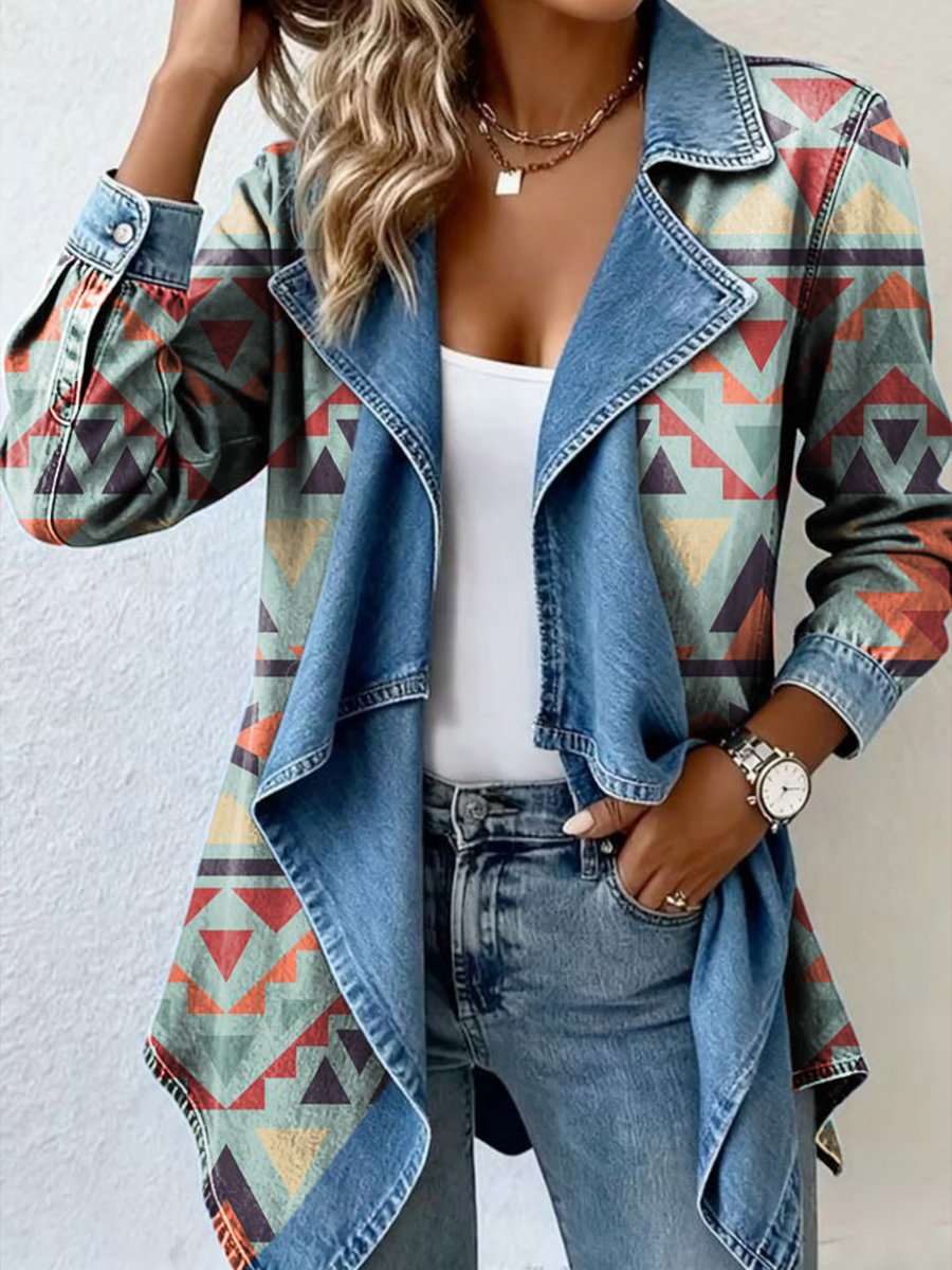 Vintage Art Print Patchwork Denim Coat
