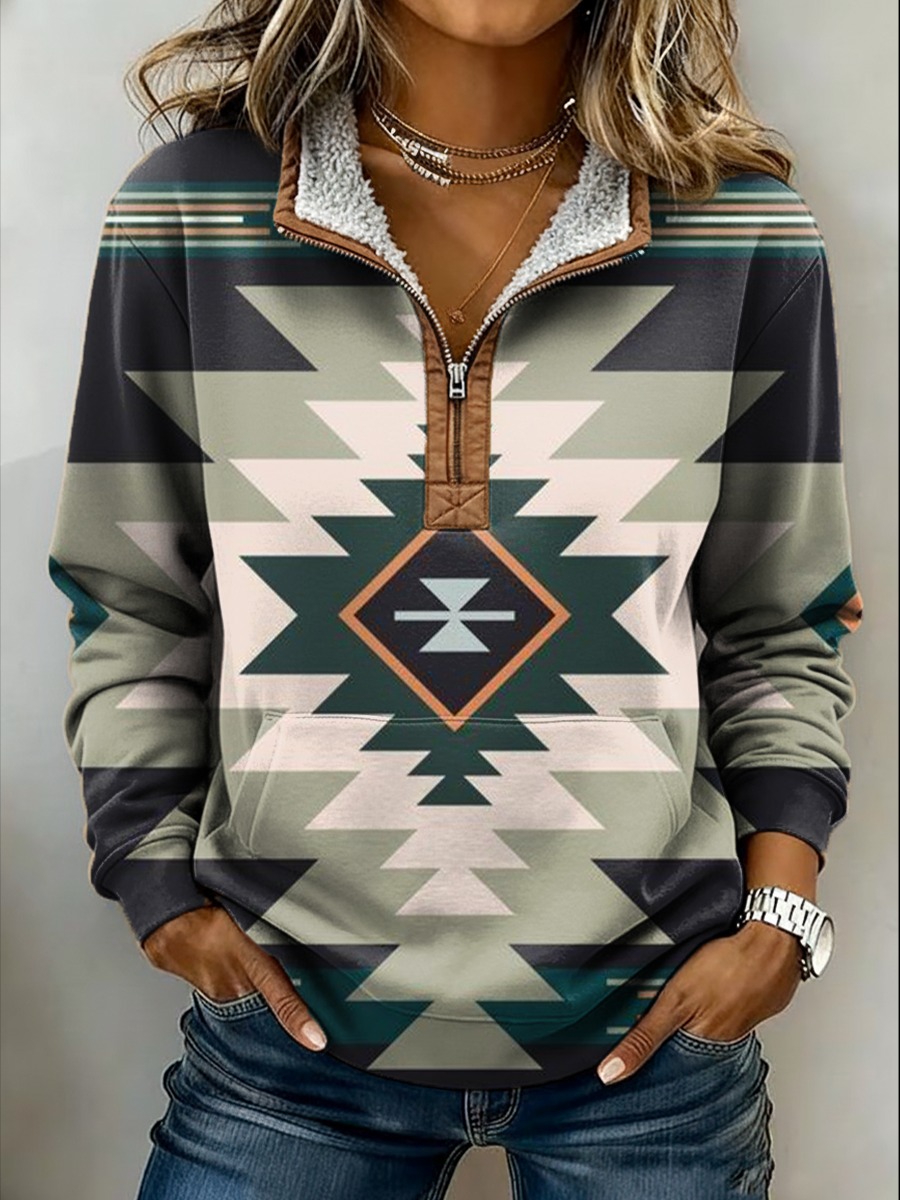 Vintage Aztec Art Print Patchwork Denim Sweater Cardigan Coat